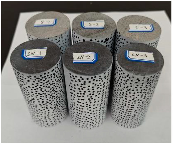 The sandstone specimens used in this experiment were obtained from the roof strata of a working face at Dingji Coal Mine in Huainan City, Anhui Province, approximately 1000 m below the surface. The large rock blocks collected on-site exhibited homogeneous texture without visible joints or fractures. These blocks were processed into standard cylindrical specimens 50 mm in diameter and 100 mm in height through cutting with a rock saw and surface polishing using abrasive paper. All specimen preparation strictly adhered to the processing standards of the International Society for Rock Mechanics (ISRM) [40]. After sanding the specimen surfaces to achieve smoothness, white paint was uniformly sprayed to ensure complete coverage. Speckle patterns were then created on the cylindrical surface using a marker pen for subsequent analysis [41]. As shown in Figure 1, six specimens were prepared in total: three sandy mudstone specimens labeled SN-1, SN-2, SN-3 and three gray sandstone specimens labeled S-1, S-2, S-3.
