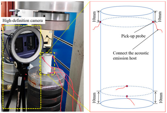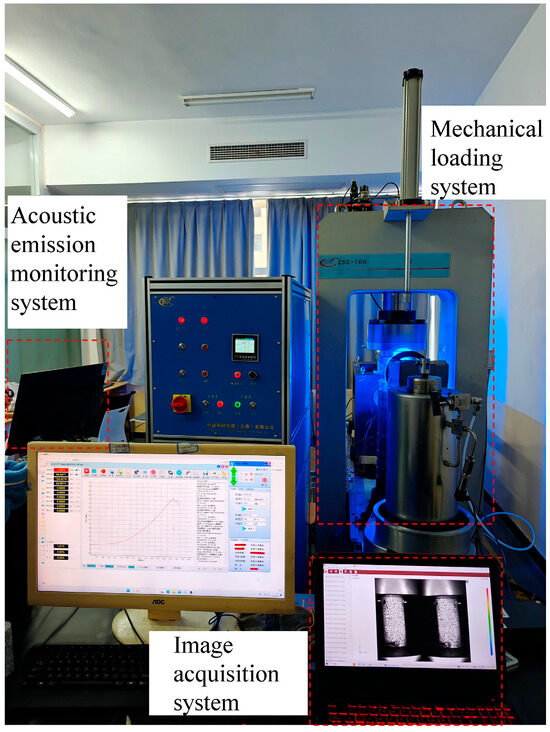 The experiment was a uniaxial compression test consisting of a loading system, acoustic emission monitoring system, and image acquisition system, as shown in Figure 2. The Digital Speckle Monitoring and Analysis System consists of an image acquisition system and an image processing terminal. The image acquisition system employs a CCD high-speed camera to capture and store full-process images of specimen loading, simultaneously transferring them to the image processing terminal. It features a capture resolution of 2448 × 2048 pixels and a speed of 1 FPS. The processing terminal utilizes Visual Strain Gauge V1.0 software for post-processing digital speckle images, enabling analysis of surface micro-deformations and generating deformation diagrams including principal strain fields, shear strain fields, and engineering strain fields during loading. Prior to testing, multiple light source adjustments are required to eliminate natural light interference. When the digital speckle monitoring system is arranged, the blue light source is first turned on to illuminate the surface of the specimen. Through the orientation and focal length test of the camera, the digital speckle image is located in the middle of the lens and in a high-definition state.