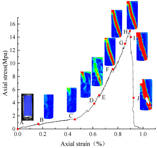 Figure 5 shows the complete loading curve of SN-1. According to the characteristics of the curve, 10 identification points are selected at typical moments: Marker A: Unloaded state; Marker B: Compaction stage; Marker C: Endpoint of compaction phase before the first significant oscillation; Marker D: Initial elastic loading stage; Markers E and F: Elastic loading stage with notable oscillations; Marker G: Plastic stage preceding peak stress; Marker H: Peak stress point; Markers I and J: Post-peak stress decline phase.
