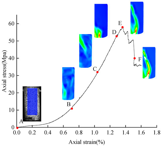 Figure 6 shows the loading curve of the entire S-3 process. Based on the curve characteristics, six marker points were selected at typical stages: the identification point A is the unloaded stage, point B marks the end of the compaction stage, point C lies in the elastic loading stage, point D indicates the elastic–plastic transition, point E corresponds to the stress peak stage, and point F denotes the stress decline stage.