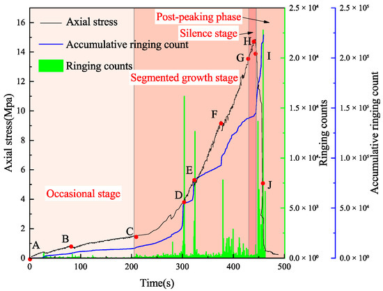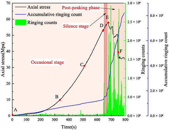 Occasional AE stage (points A–C): This stage exhibits minimal AE ring counts and cumulative counts, with only Occasional AE signals detected. This corresponds to the initial compaction stage of the specimen, where no new cracks are generated internally.
