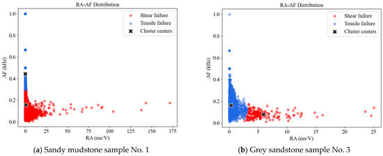 After processing and analyzing relevant experimental data, RA-AF scatter distribution plots for two lithological specimens were generated. In these plots, the y-axis, AF, represents the ratio of the acoustic emission ring-down count to the duration. The x-axis, RA, denotes the ratio of the acoustic emission rise time to the maximum amplitude. Under logarithmic coordinates, the coordinate points exhibited distinct clustering characteristics. Therefore, the K-means clustering method [42,43] was adopted to differentiate rock failure modes. As the analysis required distinguishing between shear and tensile failures, therefore, the clustering number k is specified as 2. ‘k’ is the slope boundary between shear failure and tensile failure; k < 2 is shear failure; and k > 2 is tensile failure, which is related to the iterative optimization clustering center. The analytical process is illustrated in Figure 9. The final classification results of failure types are shown in Figure 10, where blue points indicate tensile failures, and red points represent shear failures.