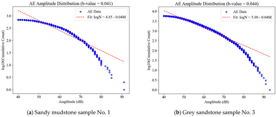 As shown in Figure 11, the fitting results for sandy mudstone exhibit significant dispersion, whereas the data for gray sandstone align well with the fitted line. The calculated b-values are 0.041 for sandy mudstone and 0.044 for gray sandstone. According to the physical interpretation of the b-value, a higher b-value suggests dominant plastic deformation and gentler failure, while a lower b-value indicates dominant brittle failure with more intense fracturing. This implies that the failure process of sandy mudstone is more violent compared to gray sandstone. This difference arises because the instability of sandy mudstone during loading occurs intermittently, generating numerous high-energy acoustic emission events even before reaching peak stress. In contrast, the loading process of gray sandstone remains relatively stable, with instability emerging primarily at the peak stress stage. However, the overall low b-values from the fitting results reflect the brittle failure characteristics of both rock types.