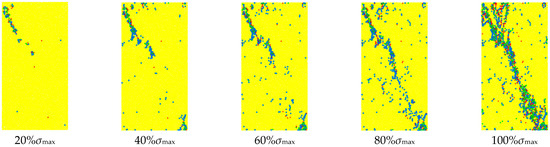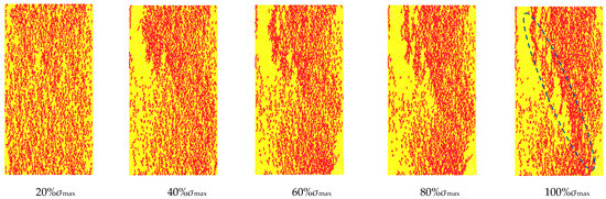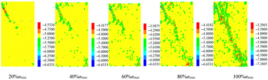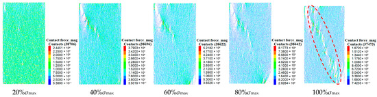 The force in the discrete granular material is transmitted from one particle to another particle. This transmission path is visualized as a chain structure, which is called a force chain. Figure 13 shows the characteristics of the rock force chain under different stress states during uniaxial loading. From the diagram, it can be seen that when the initial loading stress is low, the force chain is evenly distributed inside the rock mass, forming a network structure. With the increase in stress, the force chain sparse area appears in the upper left corner and the lower right corner, and the strength of the force chain at the edge of the area increases sharply. The sparse area expands to the center along the diagonal, and the strong force chain also develops to the center, and the length increases continuously. At 100% σmax, the sparse region of the force chain is connected into one, and several strong force chain arch structures are formed in this region. These structures are interconnected to form a clear ‘strong force chain band’.