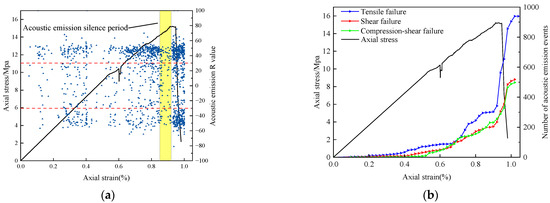 Variations of different acoustic emission event types with stress–strain. (a) R-value evolution of acoustic emission events. (b) The number evolution of acoustic emission events of different failure types.