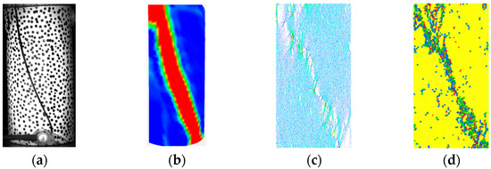 These observations collectively indicate that variations in AE events are caused by internal damage accumulation and crack development within the specimen. During the initial loading phase, although microscopic damage within the specimen remains visually undetectable, it can be effectively monitored through strain field characteristics. As cracks progressively develop and propagate, the concentrated regions of AE event localization points enable the identification of existing crack morphologies and positions while also allowing for predictive analysis of potential crack propagation directions.