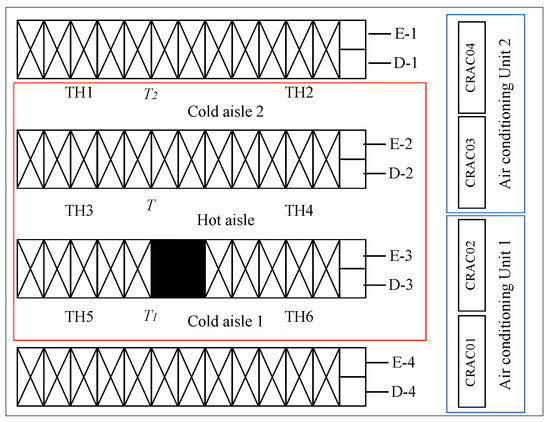 This study focuses on a data center as the subject of investigation. The layout of cabinets and terminal air conditioners in the data center is illustrated in Figure 2. To prevent server overheating, hotspots, and other issues, the data center design specifies a hot-aisle temperature range of 31 to 35 °C. In this particular data center, the cold-aisle temperature should be maintained within the range of 21 to 25 °C, with an indicated airflow volume between 2.4 and 3.9 kW·h based on power consumption over a period of 15 min.