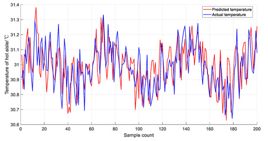 The trained hot-aisle temperature model was utilized in this study to compare the predicted temperatures with actual field measurements, based on 200 datasets collected over a specific two-day period from the test set. As shown in Figure 4, the model’s temperature predictions align closely with the observed field data, as indicated by the root-mean-square error of 0.1328 °C. The maximum prediction error is 0.3393 °C, demonstrating a strong correspondence between the model output and target values. Consequently, the established hot-aisle temperature prediction model effectively captures variations in hot-aisle temperature resulting from changes in server power consumption and adjustments made to air conditioner settings for cabinet cooling.