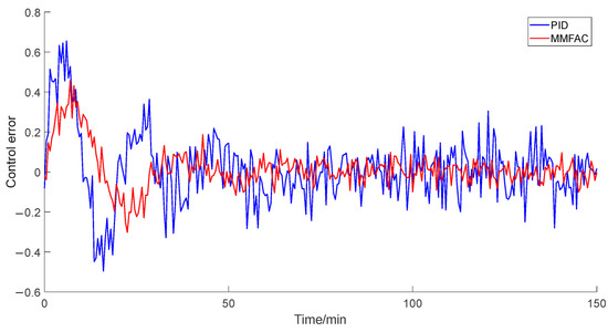 The overall temperature control error of the DQN algorithm is nearly twice that of the MMFAC method. This phenomenon is primarily attributed to the fact that the DQN algorithm is more suitable for long-term dynamic optimization problems, requiring a large accumulation of data samples during its training process. However, due to the limited duration of this experiment (200 min), the volume of accumulated data was insufficient. In contrast, the MMFAC algorithm is capable of completing optimization calculations with a relatively small amount of sample data. In terms of overshoot control, the performance of the DQN algorithm is also slightly inferior to that of the MMFAC algorithm.