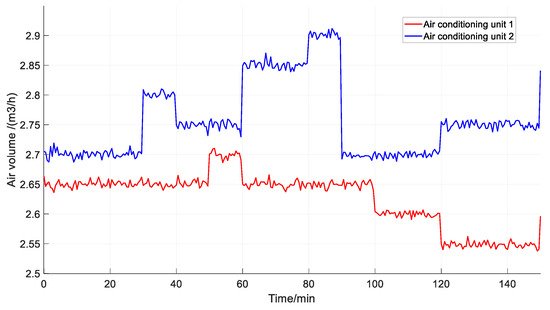 Figure 7 shows the output control quantity curves for the cold-aisle temperatures of the two air conditioning groups. It can be observed that to maintain the data center temperature at 31 °C, the energy consumption of Air Conditioning Unit 1 is consistently slightly higher than that of Unit 2. This is because Cold Aisle 1 has more server racks deployed than Cold Aisle 2, resulting in a higher cooling demand during normal data center operation. This demonstrates that the algorithm presented in this paper adaptively adjusts the cooling equipment according to actual requirements. This further reveals the reason why the MMFAC algorithm has smaller temperature control errors.