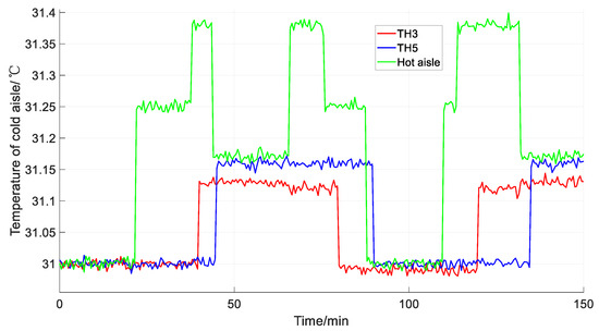 To achieve precise temperature control, different weight coefficients can be set for various devices and hot aisles. In this paper, the temperature control of cabinet TH3 is set as the highest priority with a weight coefficient of 10; the temperature control of cabinet TH5 is set as the secondary priority with a weight coefficient of 1; and the temperature control weight coefficient of the hot aisle is set as 0.1. The temperature control coefficients of the three elements are shown in Figure 8.