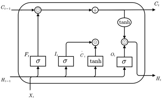 In the equations, is the input gate; is the candidate memory cell state matrix; is the memory cell state; and are the weight matrices of the input gate; and are the weight matrices of the memory cell; and and are the bias terms for the input gate and memory cell, respectively.