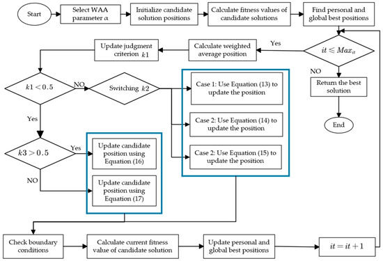 The weighted average algorithm (WAA) [31] was proposed by Jun Cheng and Wim De Waele in 2024. The concept of the weighted average position was directly introduced to develop this new metaheuristic optimization algorithm. The core idea of the WAA is to guide the optimization process using a weighted average position, where each candidate solution’s contribution is determined by its weight: the higher the weight, the stronger its influence on the final solution. As a statistical measure, the weighted average position reflects the importance of different elements through differentiated weights when calculating the overall mean, enabling the algorithm to more accurately balance global exploration and local exploitation capabilities.