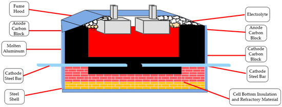 This study focuses on the aluminum electrolysis production process at the Zunyi Aluminum Plant. The core process of modern aluminum electrolysis industrial production is realized through the electrochemical reactions at the electrodes of the electrolytic cell. Figure 5 [33] illustrates a schematic diagram of the typical structure of a modern aluminum electrolytic cell. The aluminum metal produced by the reduction reaction is deposited at the bottom of the electrolytic cell, while the oxygen generated during the process is released at the top of the cell, thereby completing the electrolysis process.