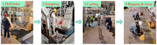 Due to extreme operating conditions such as high temperature, strong magnetic fields, and multi-field coupling, as well as the complexity of the process environment, there is a lack of online detection equipment for alumina concentration that meets the actual production requirements in industrial sites. As shown in Figure 6, current alumina concentration measurements still rely on traditional manual sampling and laboratory analysis methods. The operational process includes on-site drilling and sampling, sample cooling, packaging, and sending the samples to the laboratory for analysis. This offline detection method has obvious lag, making it impossible to achieve real-time monitoring and control of alumina concentration during the production process.