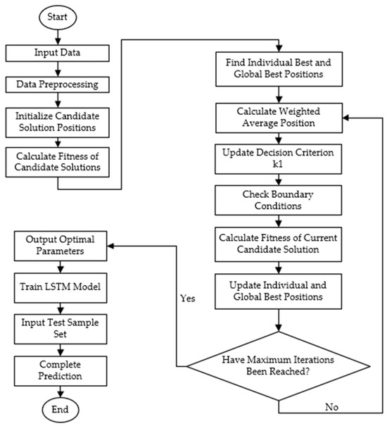 Upon reaching the maximum number of iterations, the optimized parameters are output and used to construct the final soft-sensing model. These optimal parameters are then employed to train the LSTM model. Once training is complete, the test sample set is input into the trained LSTM model to verify the model’s performance. The overall workflow of the proposed model is illustrated in Figure 7.