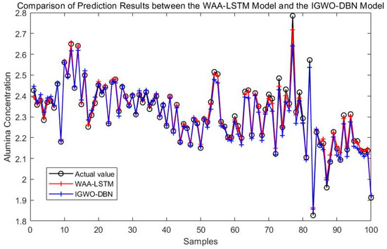 Comparison of prediction results between the WAA-LSTM model and the IGWO-DBN model.