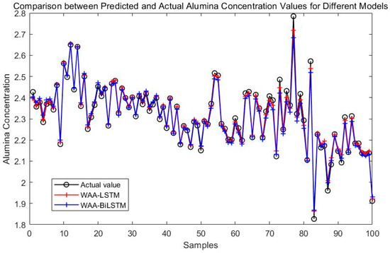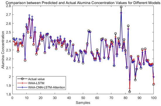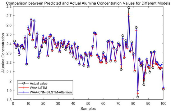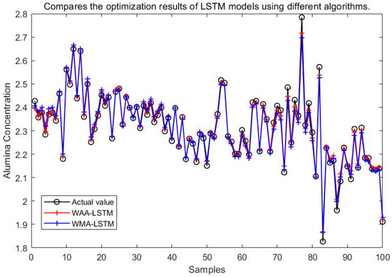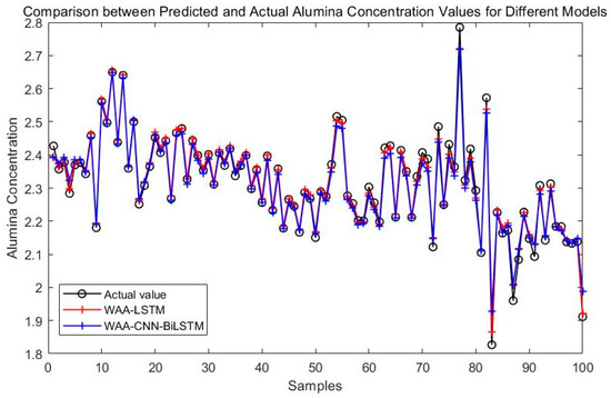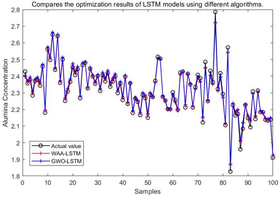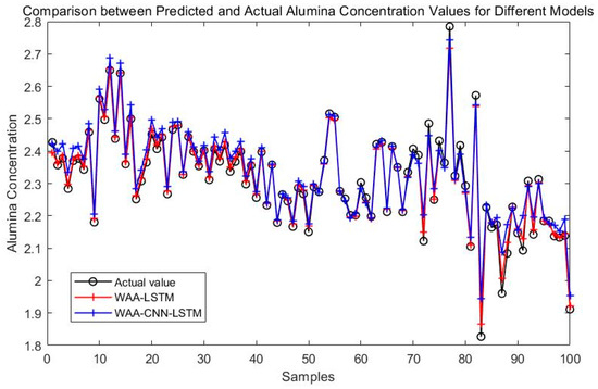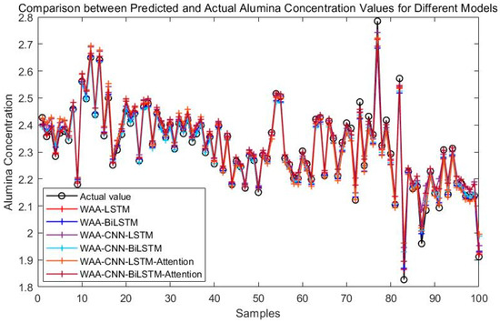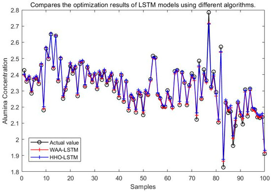 Experimental results demonstrate that the WAA-LSTM model outperforms the IGWO-DBN model across all key evaluation metrics. The WAA-LSTM model exhibits high accuracy and stability in predicting alumina concentration. To further validate its superiority, comparisons were made with hybrid models including WAA-BiLSTM, WAA-CNN-LSTM, WAA-CNN-BiLSTM, WAA-CNN-LSTM-Attention, and WAA-CNN-BiLSTM-Attention. Although the WAA-CNN-LSTM and WAA-CNN-LSTM-Attention models introduce convolutional structures and attention mechanisms to enhance feature extraction, their performance does not surpass that of the WAA-LSTM model. Similarly, models incorporating bidirectional LSTM structures (WAA-BiLSTM, WAA-CNN-BiLSTM, and WAA-CNN-BiLSTM-Attention) demonstrate improved comprehension of data and achieve competitive results in most evaluation metrics. However, their accuracy under the strictest 1% error threshold is slightly inferior to that of the WAA-LSTM model, indicating that unidirectional LSTM may offer advantages under low-tolerance error conditions. The WAA-LSTM model is compared with GWO-LSTM, HHO-LSTM, Optuna-LSTM, TOC-LSTM, and WMA-LSTM. In terms of convergence, WAA-LSTM demonstrates stable performance throughout the training process, achieving the lowest final loss, which indicates better generalization and robustness. Finally, its effectiveness and accuracy are further confirmed through the Friedman test and subsequent Nemenyi post-hoc analysis.