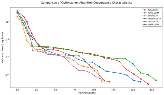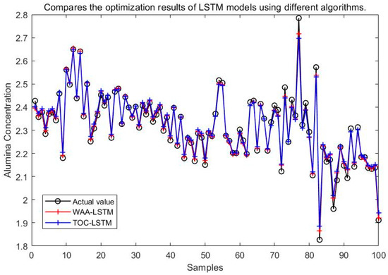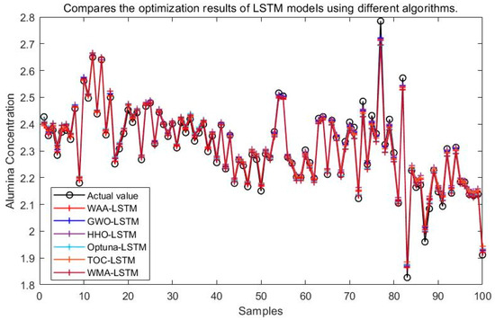 It can be seen from Figure 15, Figure 16, Figure 17, Figure 18, Figure 19 and Figure 20 that the LSTM model optimized by the WAA outperforms other models in overall performance, showing a higher degree of fit between its predicted curve and the actual values in the alumina concentration prediction task. The WAA-LSTM model exhibits rapid loss reduction in the early training stages, indicating strong convergence. As training progresses, the loss steadily decreases, reaching the lowest validation loss. The GWO-LSTM model performs comparably, trailing slightly behind. The HHO-LSTM, Optuna-LSTM, TOC-LSTM, and WMA-LSTM models maintain good performance during training but are marginally inferior to WAA-LSTM and GWO-LSTM. Overall, as shown in Figure 21, the WAA-LSTM model achieves stable training performance and the lowest final loss.