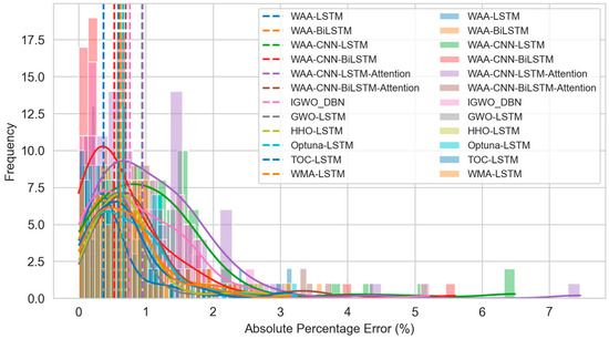 The histogram and kernel density curve in Figure 22 further depict the distribution of prediction errors. The WAA-LSTM model exhibits the flattest box and the fewest outliers, further confirming the model’s effectiveness and accuracy. To further validate the significant advantage of the WAA-LSTM model, Figure 23 presents a heatmap of -values based on the Nemenyi test. In the heatmap, darker colors indicate more significant differences between models. It is evident from the figure that the row and column corresponding to WAA-LSTM contain the highest proportion of dark-colored cells, indicating that the performance differences between WAA-LSTM and most other models are statistically significant.