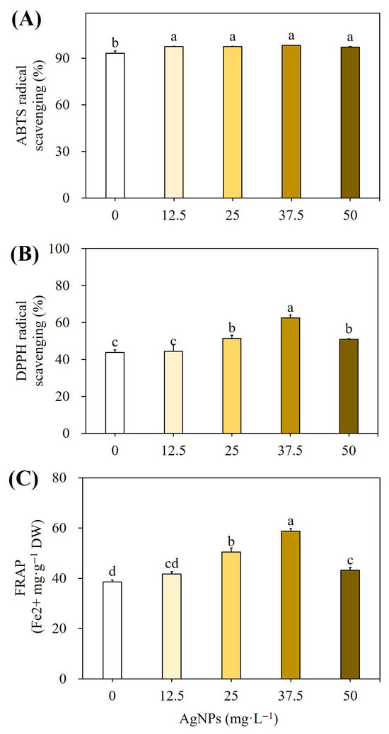 Effect of different concentrations of AgNPs on ABTS free radical scavenging activity (A), DPPH scavenging activity (B), and FRAP activity (C). Different letters indicated significant (p < 0.05) differences.