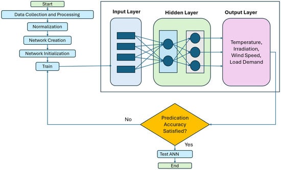 While significant progress has been made in forecasting and optimization for microgrid EMSs, several gaps remain. For instance, most of the existing forecasting models are far from fully capturing the complex nonlinear interactions among photovoltaic generation, wind turbine output, ambient temperature, and load demand, which significantly limits their accuracy under variable and dynamic conditions. While ANN-based models, especially MLP-ANNs, have been very successful in forecasting PV and WT outputs using historical data and meteorological variables [6,7], their use within a general framework of energy management systems has not been sufficiently investigated. Most previous work has concentrated on enhancing the accuracy of the forecasts without considering how these models could be integrated within a general framework of energy optimization and decision-making. Moreover, the LM training algorithm has been proved to be more accurate and with higher convergence speed compared to some other methods, such as resilient backpropagation, but its power for solving dynamic and uncertain microgrid environment problems is yet to be tapped. While prior studies [5,6,7,8,38] focus on offline optimization, this work’s framework is designed for real-time deployment, though experimental validation remains future work. The dataset comprises 1 year of hourly resolution data (8760 samples) for PV/WT generation, temperature, and load demand from a microgrid in Ajman, UAE. Development and implementation of an MLP-ANN-based forecasting model within energy management systems could bridge the gap in allowing better accuracy and more informed decision-making.