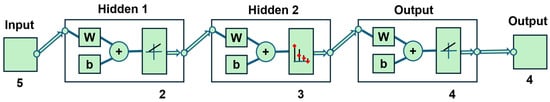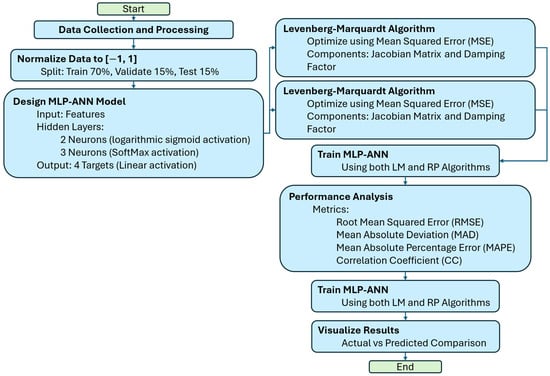 The proposed structure is designed on three significant layers for the MLP model: an input layer, a hidden layer, and an output layer. The model can also contain one or more activation functions in the hidden layer. To determine the best predictive model for solar irradiance, ambient temperature, wind speed, and energy demand, this study employs two training methods, namely LM and RP. This network features two hidden layers, designated as H1 and H2, which comprise two neurons in the first layer and three neurons in the second layer. Following several attempts and evaluating various alternatives, the log-sigmoid activation function [41] was selected for the first hidden layer, while the SoftMax [42] was designated for the second layer. The output layer employed a linear activation function. Figure 1 and Figure 2 illustrate the configuration of MLP-ANN and the overarching architecture of the neural network, respectively. Figure 1 demonstrates the methodology employed for training and testing utilizing MLP-ANN to predict four distinct outputs. Figure 2 illustrates the transfer functions integrated within the model.