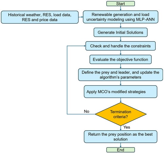 - In this paper, the MCO algorithm is proposed, adding advanced mechanisms of exploration and exploitation to traditional metaheuristic approaches, like cheetah optimizer (CO) [39], PSO, and teaching–learning-based optimization (TLBO) [40] algorithms. MCO successfully solves microgrid scheduling problems containing high-dimensional and nonlinear optimization;