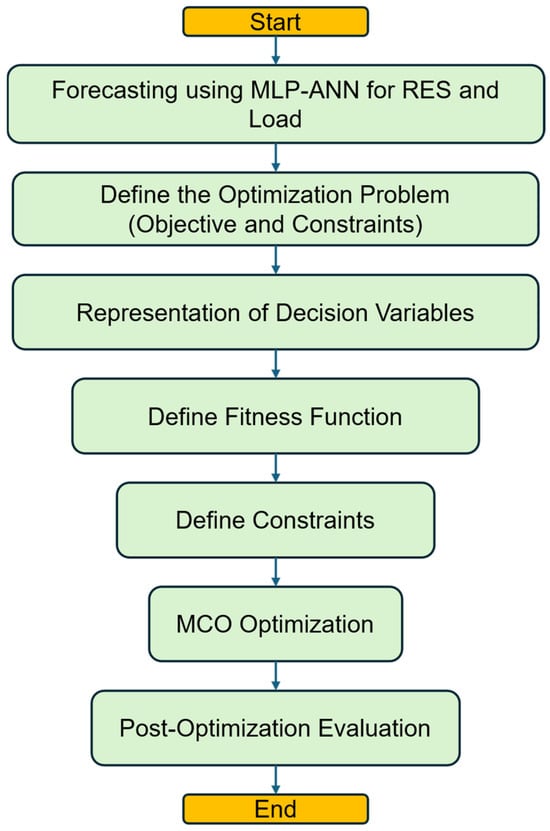 The rest of the paper is organized as follows: Section 2 defines the optimal EMS’s formulation; Section 3 presents the proposed MLP-ANN forecasting method. Section 4 presents the proposed MCO algorithm in detail. Section 5 discusses the simulation results regarding system performance. Finally, Section 6 concludes this paper and advises on further areas of research.