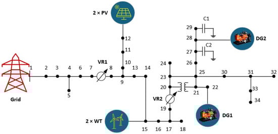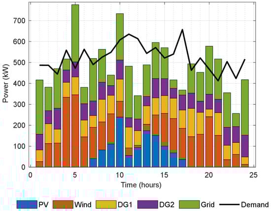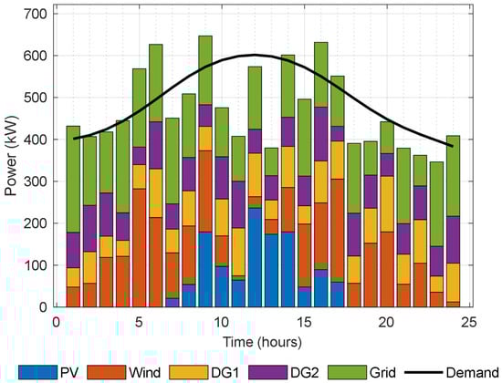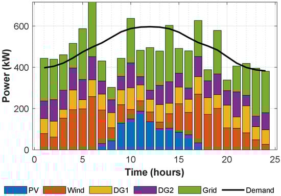 where the system’s total operational cost is denoted as . indicates the operational expenses of renewable generation (WT and PV with the cost coefficients of and , respectively) at their respective nodes. represents the cost of purchasing power from the primary utility, which is susceptible to time-of-use (TOU) pricing (). The cost associated with diesel generators, including their operational costs, is denoted by , which is calculated using specific cost coefficients and for diesel generator i. The costs associated with the demand response program are denoted by and are elaborated upon below.