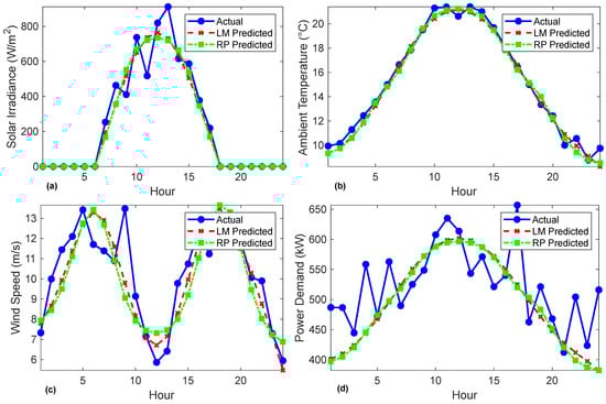 - Development of ML-based forecasting models using an MLP-ANN trained with LM and RP algorithms for the prediction of PV and WT generation, ambient temperature, and load demand. The proposed approach will have higher accuracy; LM performed better as compared to RP;