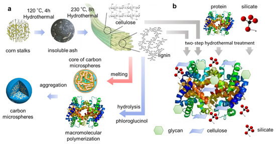 A schematic diagram of the microscopic synthesis mechanism is shown in Figure 2b. During the low-temperature hydrothermal stage, most of the cellulose and lignin remain unhydrolyzed. A small amount of impurities that are difficult to form into spheres are hydrolyzed and then removed. Some silicates are adsorbed onto the multi-level structures formed by a small amount of proteins through ionization and high-pressure adsorption during the initial low-temperature hydrothermal stage. Although the protein content in corn stalks is relatively low, with a mass percentage of approximately 5.53–6.33%, due to the long-chain polymer characteristics of the protein structure and its multi-level structural properties, the quaternary structure of protein molecules forms a natural reticular carbon skeleton. The linear long chains in the primary structure are conducive to providing a highly ordered arrangement of carbon atoms, facilitating the polymerization of carboxyl and hydroxyl functional groups. This is because the highly ordered long-chain carbon skeleton avoids the situation where carboxyl and hydroxyl groups cannot successfully bond with the long-chain carbon skeleton due to spatial constraints. The secondary structure, which is mostly planar and often in a helical or folded arrangement, and the tertiary structure, which often presents as a three-dimensional structure providing effective branches through the extension of molecular chain side chains, ultimately enable the full integration of cellulose, polysaccharides (such as dextran, xylan, arabinan, and other polymeric sugar-based organic substances), and silicates under the action of the protein’s multi-level structure [22,23].