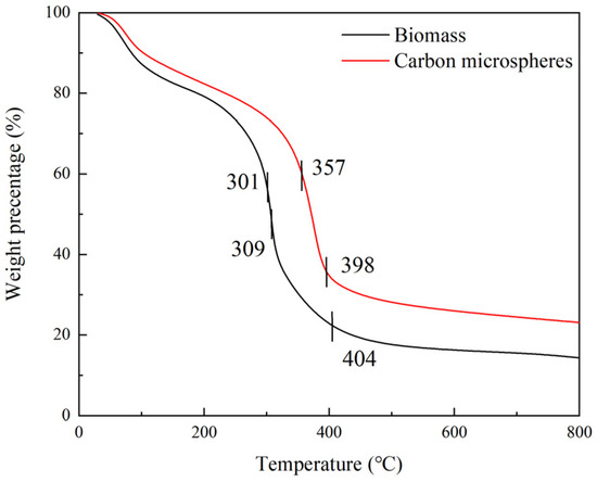- Thermogravimetric analysis. Using a TGA thermogravimetric analyzer (TA Instruments, Leatherhead, UK), the thermal stability of biomass and modified carbon microspheres was tested. The heating rate was 10 °C/min, the atmosphere was nitrogen, and the heating range was 20–800 °C.
