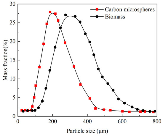 Particle size distribution curve of stover biomass and modified functional dense-structured carbon microspheres.