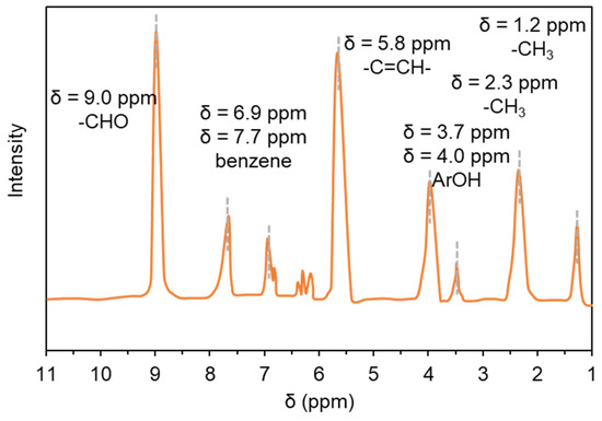 The peak at a chemical shift of δ = 1.2 ppm is due to the -CH3 group at the end of long-chain molecules. The peak at δ = 2.3 ppm is attributed to the -CH2- group in the carbon skeleton. The peaks at chemical shifts of δ = 3.7 ppm and δ = 4 ppm are caused by the ArOH functional groups from polysaccharides and phloroglucinol. The peak at δ = 5.8 ppm arises from the -C=CH- group formed after the decomposition and condensation polymerization of cellulose molecules. The peaks at δ = 6.9 ppm and δ = 7.7 ppm are due to the hydrogen atoms in the benzene rings. The peak at δ = 9 ppm is caused by the -CHO functional group generated during the decomposition of phenolic substances.