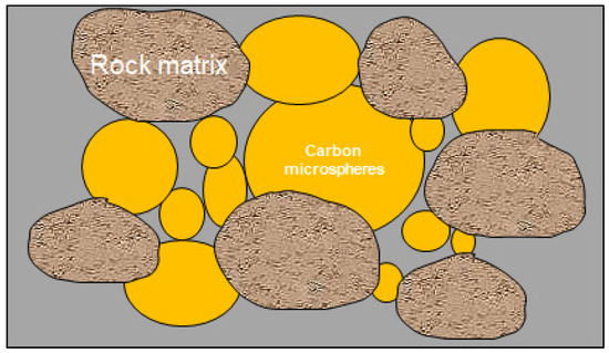 In the high-temperature hydrothermal carbonization stage, under the high-temperature and high-pressure conditions of the hydrothermal reactor, the incompressible molecules at the microscopic level, such as silicates, are firmly anchored within the main and side chains of the protein molecules by the protein’s multi-level structure. The silanol groups (Si–OH) on the silicate surface can form hydrogen bonds with hydroxyl (-OH) groups in cellulose or amide (-CONH) groups in proteins, creating a stable interfacial interaction. Most of the cellulose is hydrolyzed into aldehyde compounds, while most of the lignin and some of the polysaccharides (such as dextran, xylan, arabinan, and other polymeric sugar-based organic substances) are hydrolyzed into phenolic compounds. The artificially added phloroglucinol serves as another part of the organic carbon source, providing benzene ring structures to increase the spatial density at the molecular level. Furthermore, triphenylphenol can partially transform into highly stable aromatic carbon structures (e.g., graphitic or amorphous carbon) via polycondensation of its aromatic rings. A small portion of the phenolic compounds melts to form the core of the carbon microspheres [24,25].