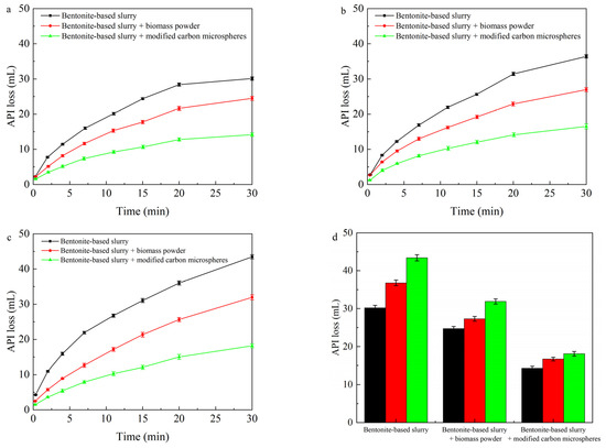 As shown in Figure 9, it can be observed that the API fluid loss gradually increases with time. The addition of both biomass and functional dense-structured carbon microspheres can reduce the fluid loss of the base mud.