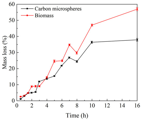 Biomass and microcarbon balls were immersed in 20 g of sodium carbonate solution with a pH of 9, placed in an oven at 180 °C for a certain period of time, removed, rinsed three times with distilled water, and then dried in a vacuum-drying oven at 105 °C until a constant weight was achieved. Their mass was measured, and the degradation rate was calculated. The experimental results are shown in Figure 8.