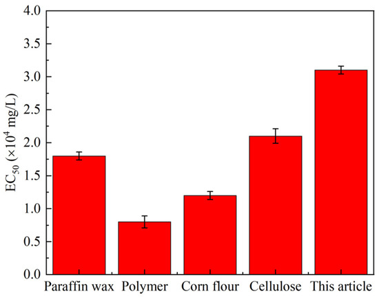 Figure 11 shows that when comparing the functional dense-structured carbon microspheres with previous polymers, white oil, cellulose, and corn flour, the EC50 value of this material is 31,000 mg/L, which is greater than 25,000 mg/L. Therefore, the functional dense-structured carbon microspheres exhibit good environmental performance.
