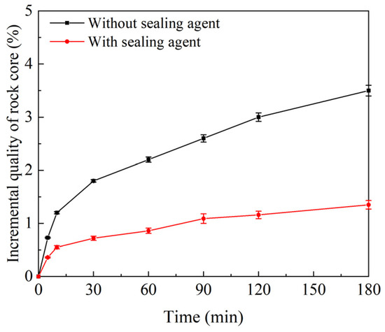 Figure 12 shows that after adding carbon microspheres, the mass increment of the core free adsorption was smaller than that of the control experimental group, indicating that they have a good sealing effect and can form mud cakes on the rock surface. The mechanism of action is similar to the filtration reduction mechanism.