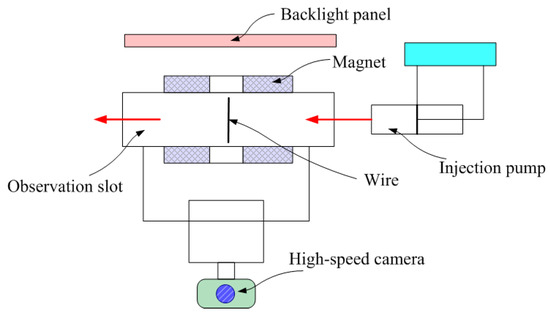 The experimental observation part consists of an experimental flow cell, a wire medium support, and a high-speed camera. Experiments on the adsorption and accumulation of particles on the wire medium are mainly carried out, and the experimental process and results are observed. Two permanent magnets with dimensions of 50 × 10 × 10 mm (length × width × height) and an inherent magnetization of 1.3 T are placed in the flow cell. The magnetization direction is perpendicular to the flow direction of the flow cell, constructing a vertical configuration of the single-wire HGMS system. The experimental results are recorded through real-time observation by a high-speed camera. The high-speed camera used is a Fastcam Mini UX high-speed camera, along with a light source and a computer. The light source is an LED side-emitting flat-panel light produced by Xinmengtai Company, with dimensions of 30 × 60 cm, a rated power of 55 W, and a color temperature of 4000 K. A Fastcam Mini UX high-speed camera serves as the core component of this system. This type of camera is developed by PHOTRON Company; its maximum shooting speed (full frame) can reach 4000 fps, the maximum resolution is 1280 × 1024, the shortest exposure time is 1 μs, the pixel size can reach 10 μm, and its external dimensions are 120 × 100 × 90 mm. Its AC power supply is applicable within the ranges of 100~240 V, 50~60 HZ, and 40 VA.