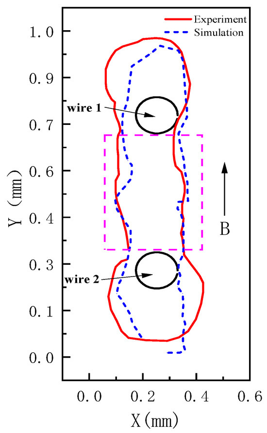 The left panel of Figure 4 presents a cumulative-state image obtained from the experiment, from which the stacking profile (yellow solid line) can be extracted. Simulations were conducted under identical conditions, and the stacking profile (black solid line) of the simulation results was similarly extracted, as shown in the right panel of Figure 4. A comparison of the stacking profiles between the experiment and the simulation is shown in Figure 5. In Figure 5, B represents the background magnetic field strength, and the pink frame indicates the region between two double wires. It can be observed that the experimental and simulated profiles exhibit good coincidence within the inter-wire region, with the simulation predictions more closely approximating the experimental outcomes.