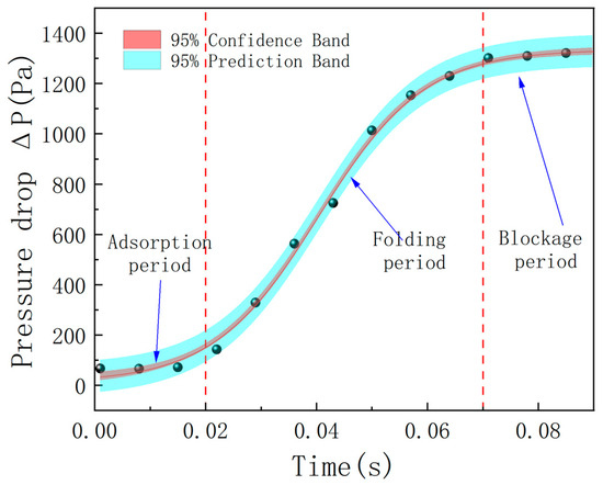 From the microscopic evolution shown in Figure 8, it can be seen that the particles are mainly deposited directionally in the magnetic field attraction area between the wire media. As the cumulative structure expands, the distance between the wires is gradually compressed. This geometric constraint leads to the contraction of the flow channel. The closed particles reduce the flow cross-section, and the local increase in flow velocity directly causes a sharp increase in the pressure drop, driving the pressure drop in the “closure stage” into a rapid upward channel, laying a kinetic foundation for the complete blocking in the subsequent stage.