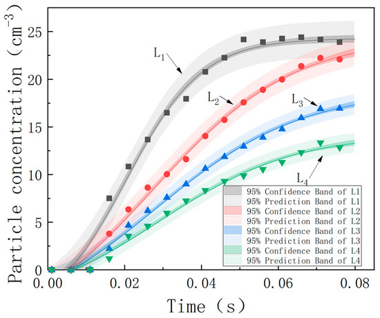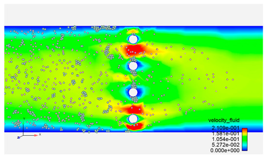 To further analyze the influence of different spacings on the agglomeration and accumulation of particles, as can be seen from Figure 14, for a single fixed spacing, as time increases, the particle concentration between the media also shows an obvious staged pattern; for different wire medium spacings, the variation ranges of the number of particles are different, and as the spacing increases, the increasing amplitude of the number of particles in a fixed area also decreases.