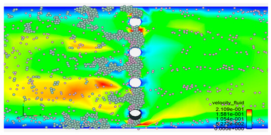 As can be seen from Figure 12, with an increase in the ore feeding speed, the separation pressure drop shows an obvious upward trend. Specifically, when the ore feeding speed is low (such as 0.05 m/s and 0.1 m/s), the fluid flows slowly in the medium, and the particles are subject to relatively low resistance during the deposition process, so the pressure drop (<40 Pa) is also small. At this time, the particle deposition is mainly concentrated on the surface of the medium, forming a relatively loose deposition layer, which helps to maintain a low pressure-drop level.