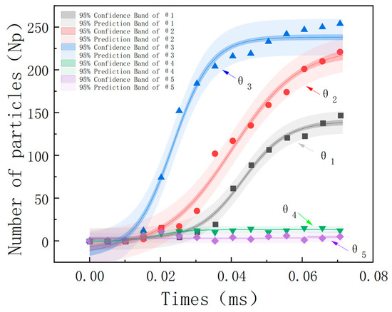 First, the adsorption regions of the double-wire medium with different configurations are divided; then, the number of particles in different adsorption regions is counted, as shown in Figure 10. A sector angle within a range of 150° is selected and divided into five small sector regions () for statistical calculation.