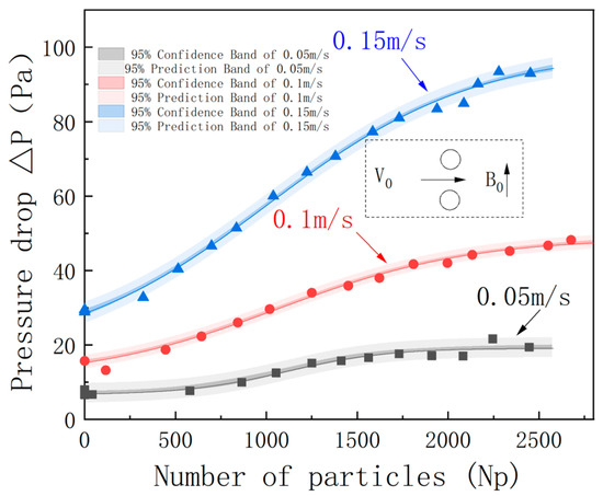 The feeding velocity is a critical parameter in HGMS. During the HGMS process, the feed is pumped into the system. Altering the feeding velocity changes the fluid dynamics within the medium, which, in turn, affects the structural morphology and strength of the particle deposits. Based on the reference operating conditions, we varied the feeding velocity to analyze its impact on the particle deposition process and separation pressure drop. The feeding velocities were set at 0.05 m/s, 0.1 m/s, and 0.15 m/s according to industrial practices. The relationship between the pressure drop and the cumulative number of particles is shown in Figure 12. Notably, the inset in Figure 12 depicts the feeding direction and magnetic field orientation.