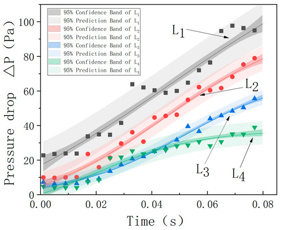 Figure 13 shows the relationship between the separation pressure drop and time under different wire medium spacings in the vertical configuration. As can be seen from the figure, after the particles are adsorbed by the wire media with different spacings, the pressure drop of the wire media is significantly affected. For a single fixed spacing, as time increases, the pressure drop () between the media shows an obvious staged pattern; for different wire medium spacings, the variation ranges of the pressure drop are different. As the spacing increases, the increasing amplitude of the pressure drop decreases.