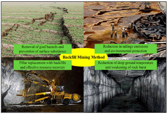 As shallow mineral resources continue to decrease, it is inevitably necessary to turn to deep formations, and deep mining places more stringent requirements on backfill strength [1]. In recent years, most mines have chosen non-pillar backfill mining methods at home and abroad. The superiority of the backfill mining method over the traditional open-stope method is shown in Figure 1, and comprises, for example, the removal of goaf hazards, the prevention of surface subsidence, a reduction in tailings emissions, environmental protection, pillar replacement with backfills, effective resource recovery, a reduction in deep ground temperature, weakening of rock burst, etc. One characteristic of this mining method is that, because backfill may be exposed during mining in pillars or two-step mine rooms, it is important to accurately design the backfill strength required by underground one-step mining to ensure the stope stability of mining in two-step mine rooms and reduce the cost of backfill by decreasing cement consumption [2].