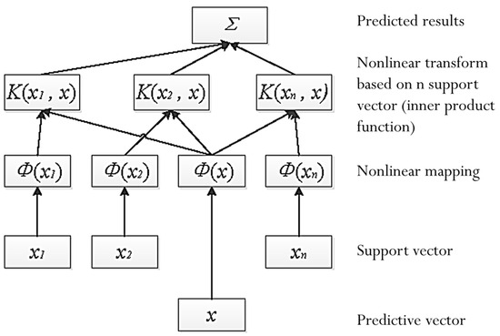 A nonlinear problem can be mapped into a high-dimensional feature space using nonlinear transformation [27]. In this high-dimensional feature space, the inner product operation of a linear problem can be replaced by a kernel function, meaning that then, the SVM fitting function is obtained as: